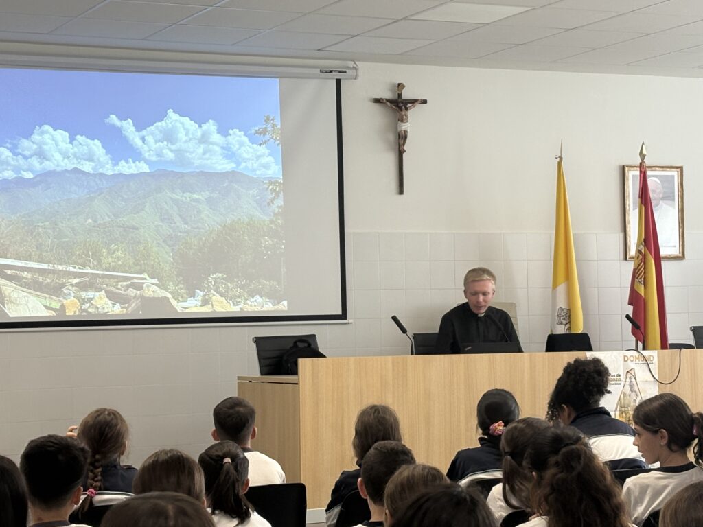 El colegio Karol Wojtyla , situado en la urbanización del Quiñón (Seseña) invitó a la Delegación de Misiones a acudir a sus instalaciones y compartir la mañana lectiva del viernes más próximo al día del Domund con los alumnos de los cursos de secundaria, para que conocieran la experiencia misionera del joven sacerdote P. Pablo Carralero, joven en edad, aunque veterano en sus experiencias en la misión.